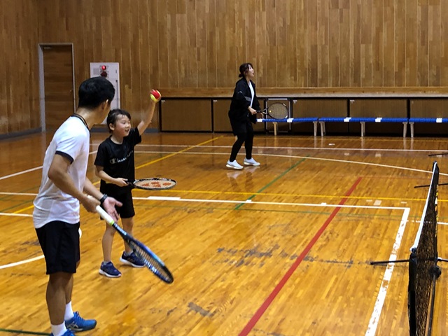 まずはラケットを使ったキャッチボール。2~3mだと思い通りにコントロールできますが,相手との距離が離れると難しさもUPします。その境の距離でお互い腕を磨き合いました(後ろは壁なのでボールを逸らしても大丈夫です)。