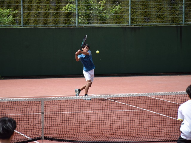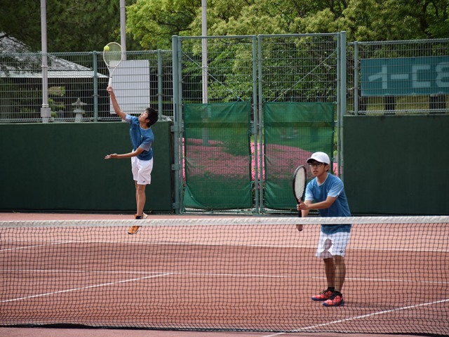 僕たち男子テニス部は,一球でも多くラリーを続けて得点できるように心掛けています。部員たちの絆も強く、どんなときでも声を掛け合って、一緒に成長しています。シングルス・ダブルス・団体戦の全てで結果が残せるように、日々みんなで頑張っています。