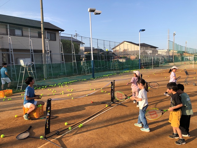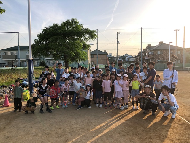 今日の集合時間はいつもより90分早い16時30分。熱い日差しの中,打ち合わせをしました。本番ではできるだけみんなが「出演」できるよう,1面に46人全員が入ってストロークの球出し練習をしました。4分という限られた時間でしたが,楽しく活動している様子や,キャプテンや小学生へのインタビューなど,テニス教室の様子を詳しく紹介していただきました。