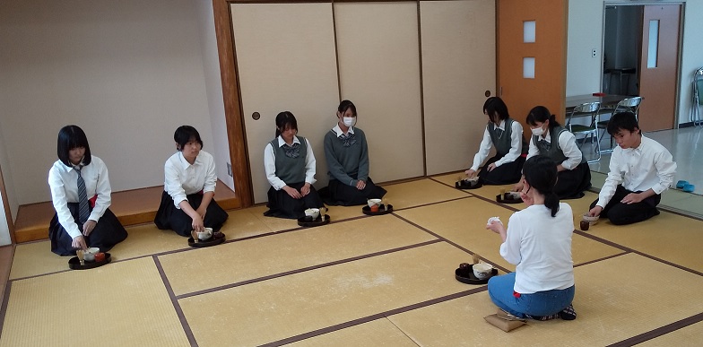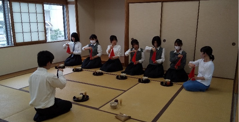 | 私たち茶道部は、裏千家の宮浦久子先生をお迎えして、毎週月曜日、金曜日に、岡田記念館2階で活動しています。 2018年度は、お茶とお菓子が大好きな2年生3名、1年生10名が、協力し合って、和気あいあいとした雰囲気の中、楽しく活動しています。 みんな初心者ですが、宮浦先生のご指導のもと、作法の初歩から丁寧に教えていただいています。 |