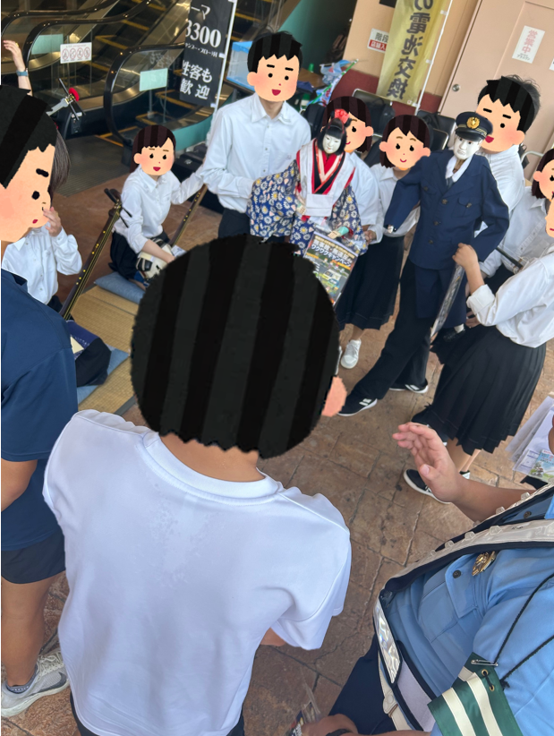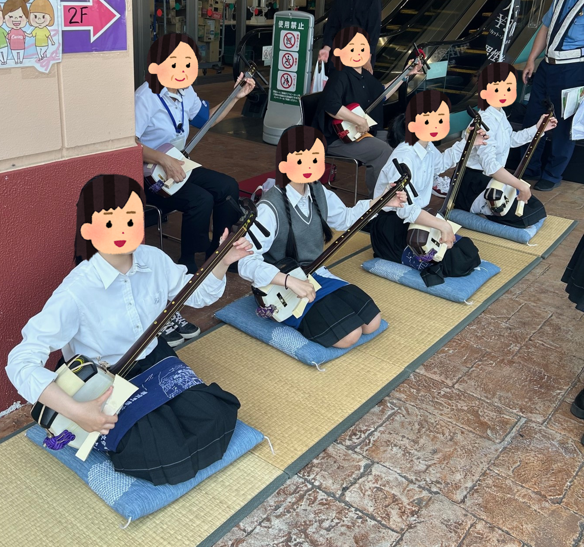 また、県警から三味線を弾ける方お二人にも参加していただき、6丁の三味線で配布のBGMとして三番叟の「メリヤス」を演奏しました。