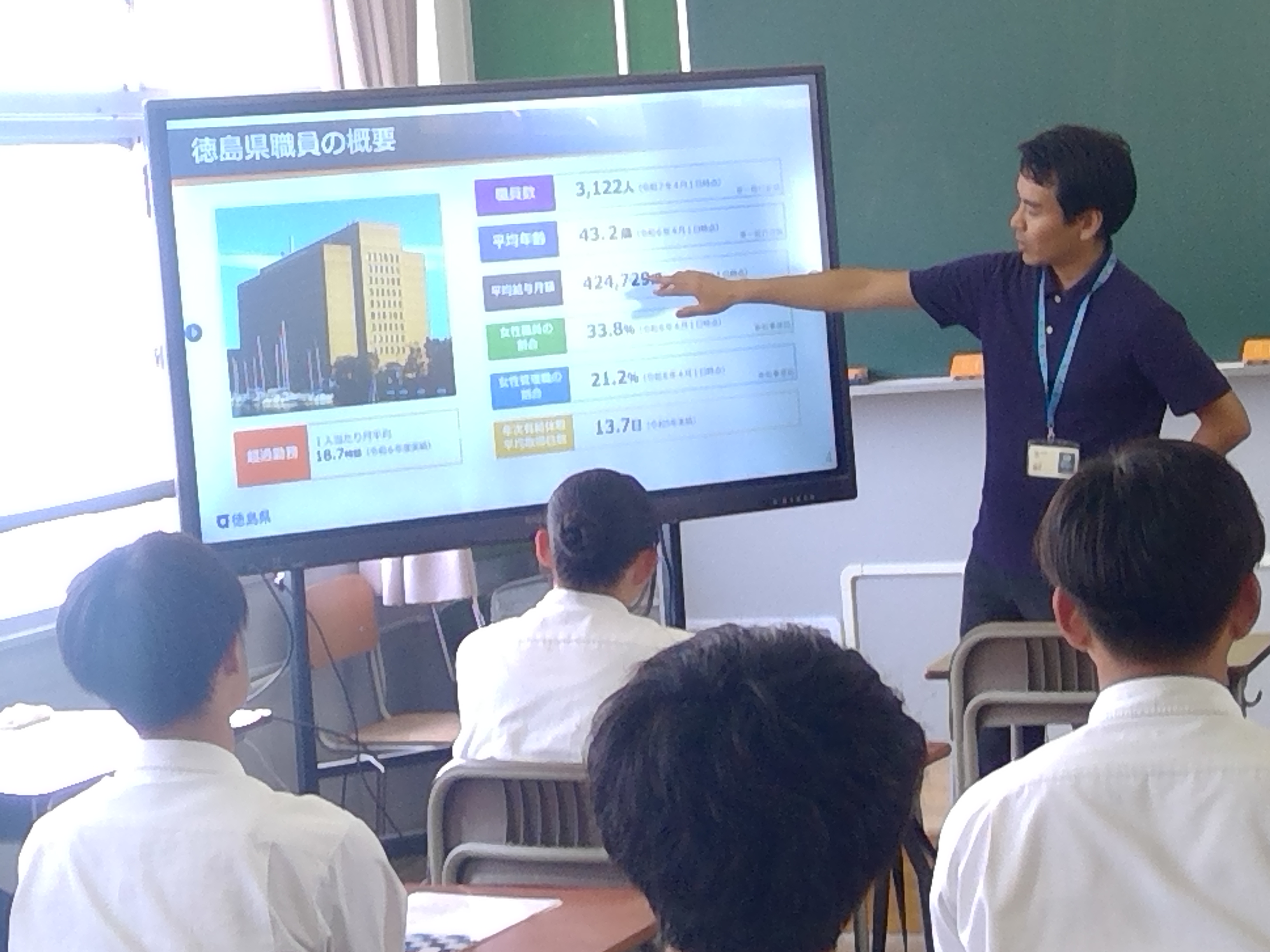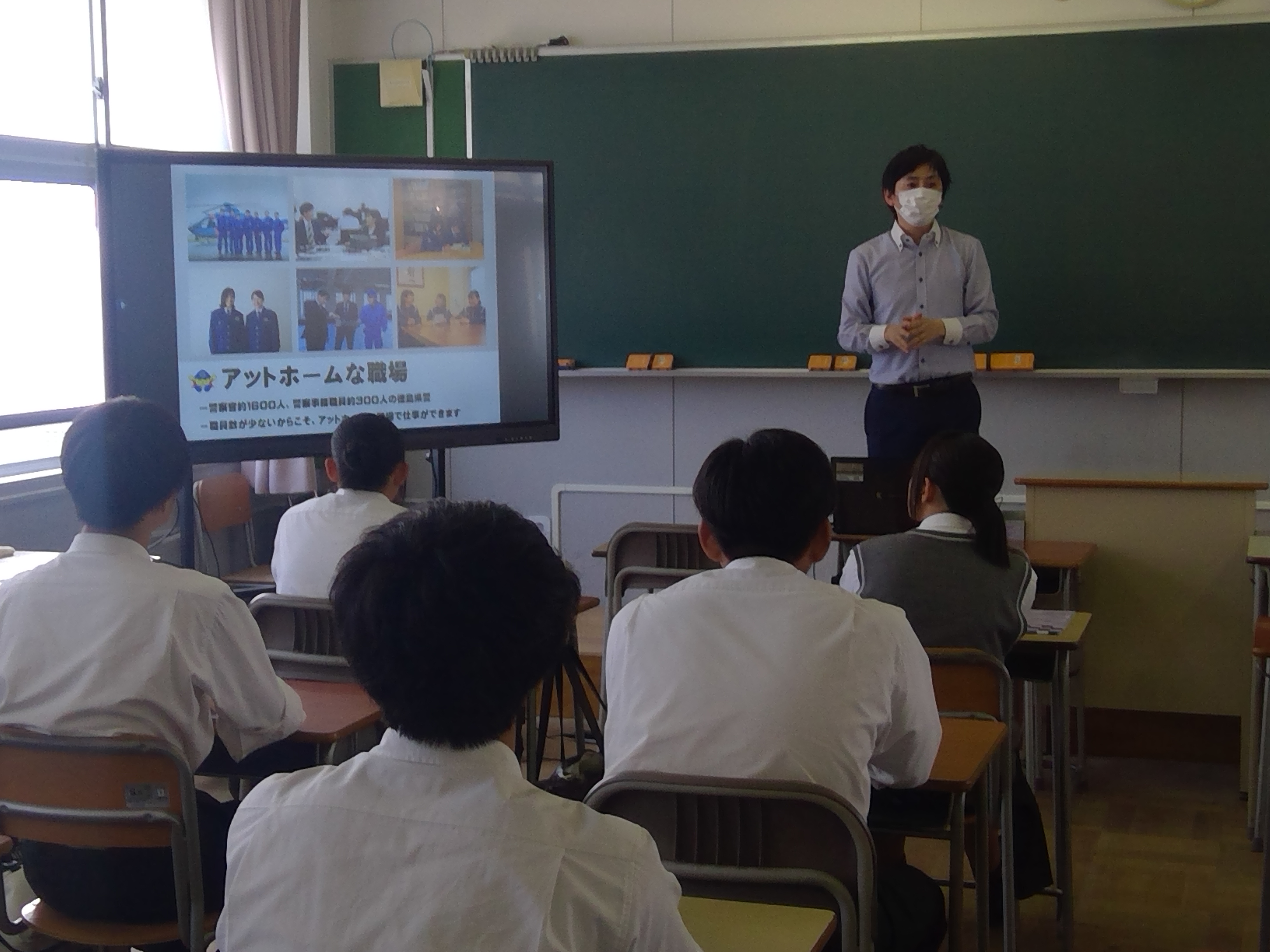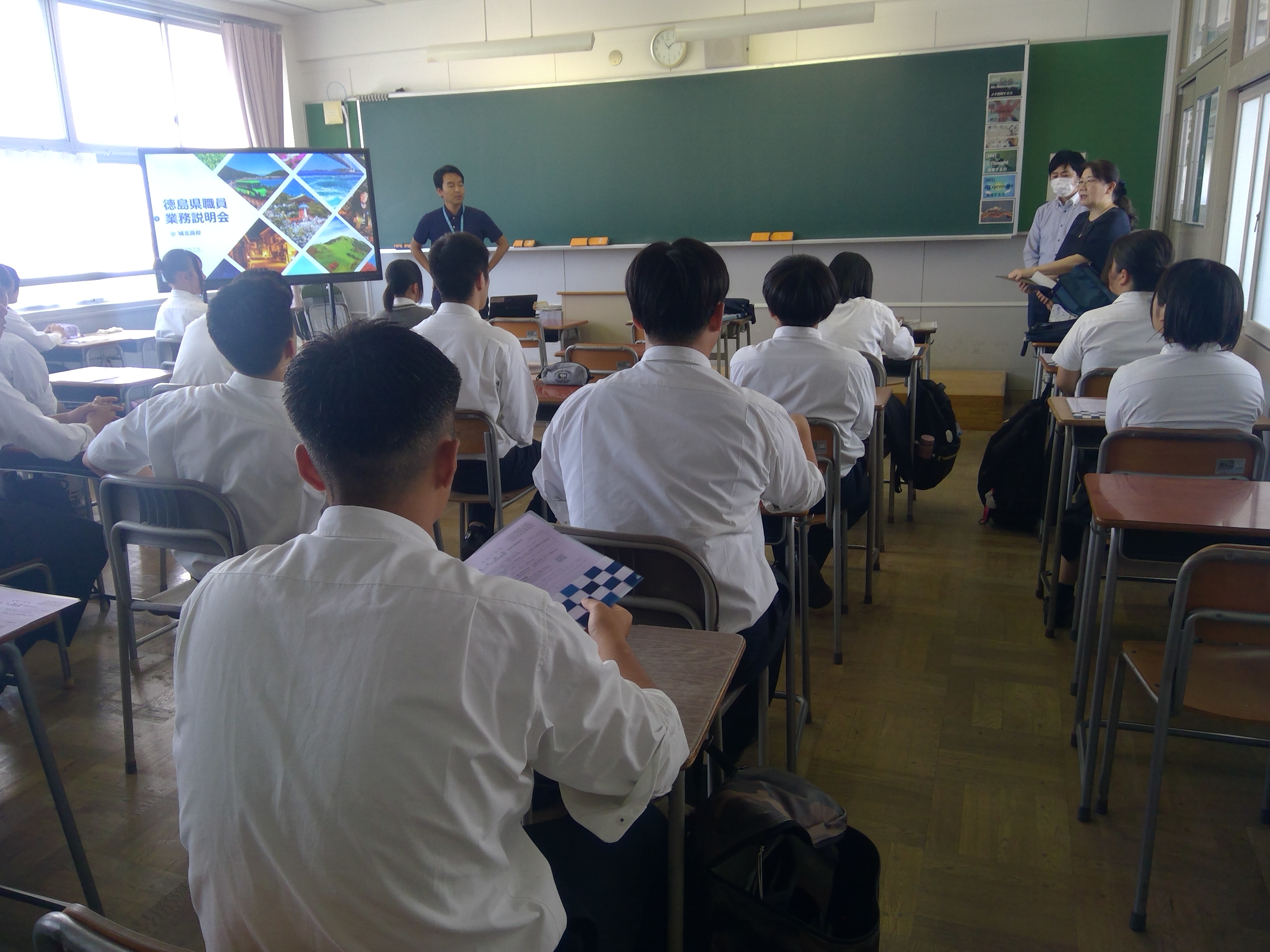 7月9日(水)14時より、徳島県職員・徳島県警察官の進路説明会を開催しました。県庁および県警の人事担当の方から、仕事内容、やりがい、福利厚生、採用試験等についてのお話をきくことができました。参加した生徒たちは、真剣な態度で説明を聴いていました。会の終了後にも、個別に質問する生徒の姿もあり、有意義な説明会となりました。