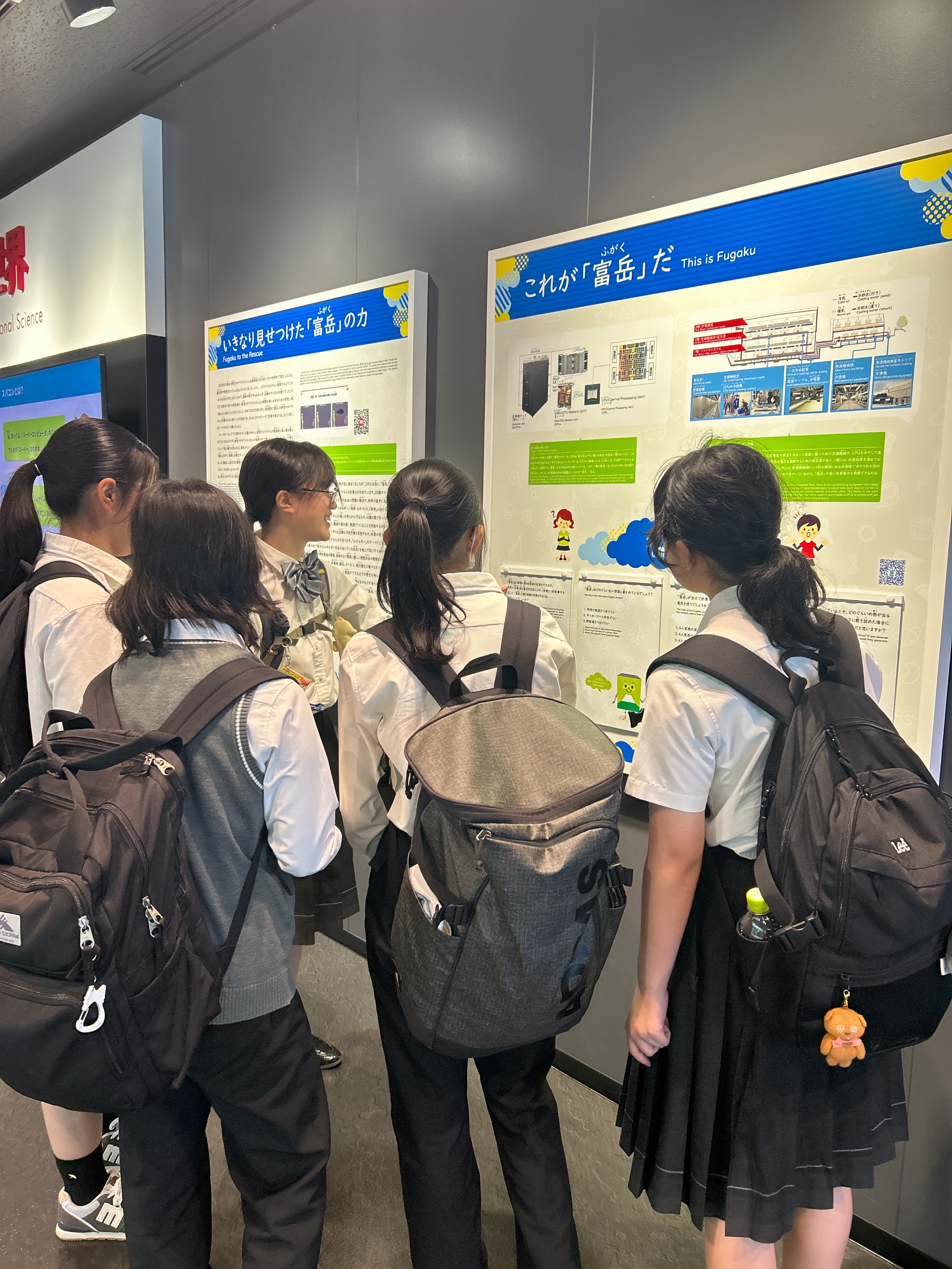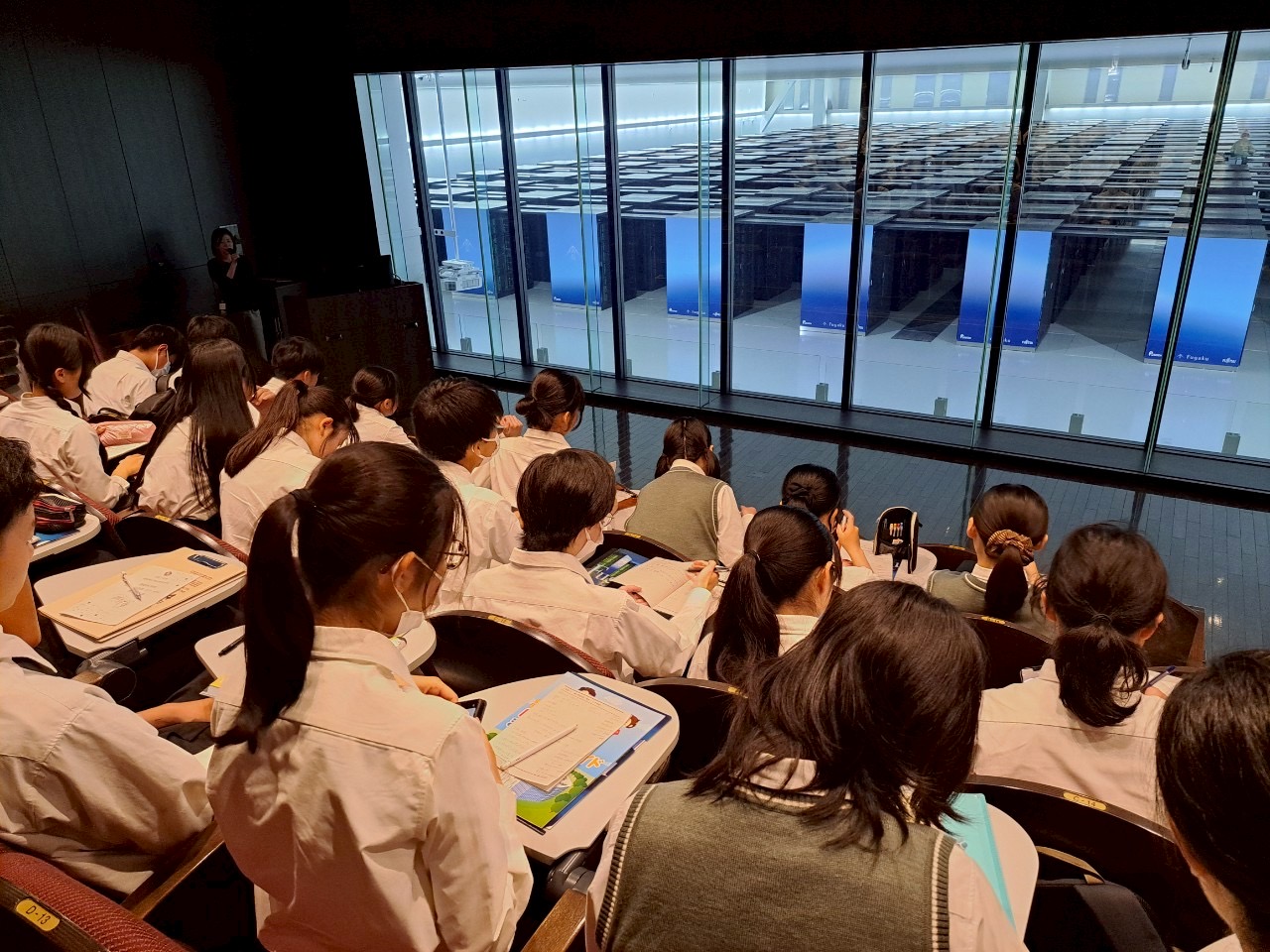 まずはじめに訪問したのは理化学研究所「富岳」です。スーパーコンピュータ「富岳」が可能にした分子動力学に基づいた高度なシミュレーションや、創薬プラットフォームの説明を聞いた後、富岳のRack装置を目の当たりにし、歓声が上がりました。