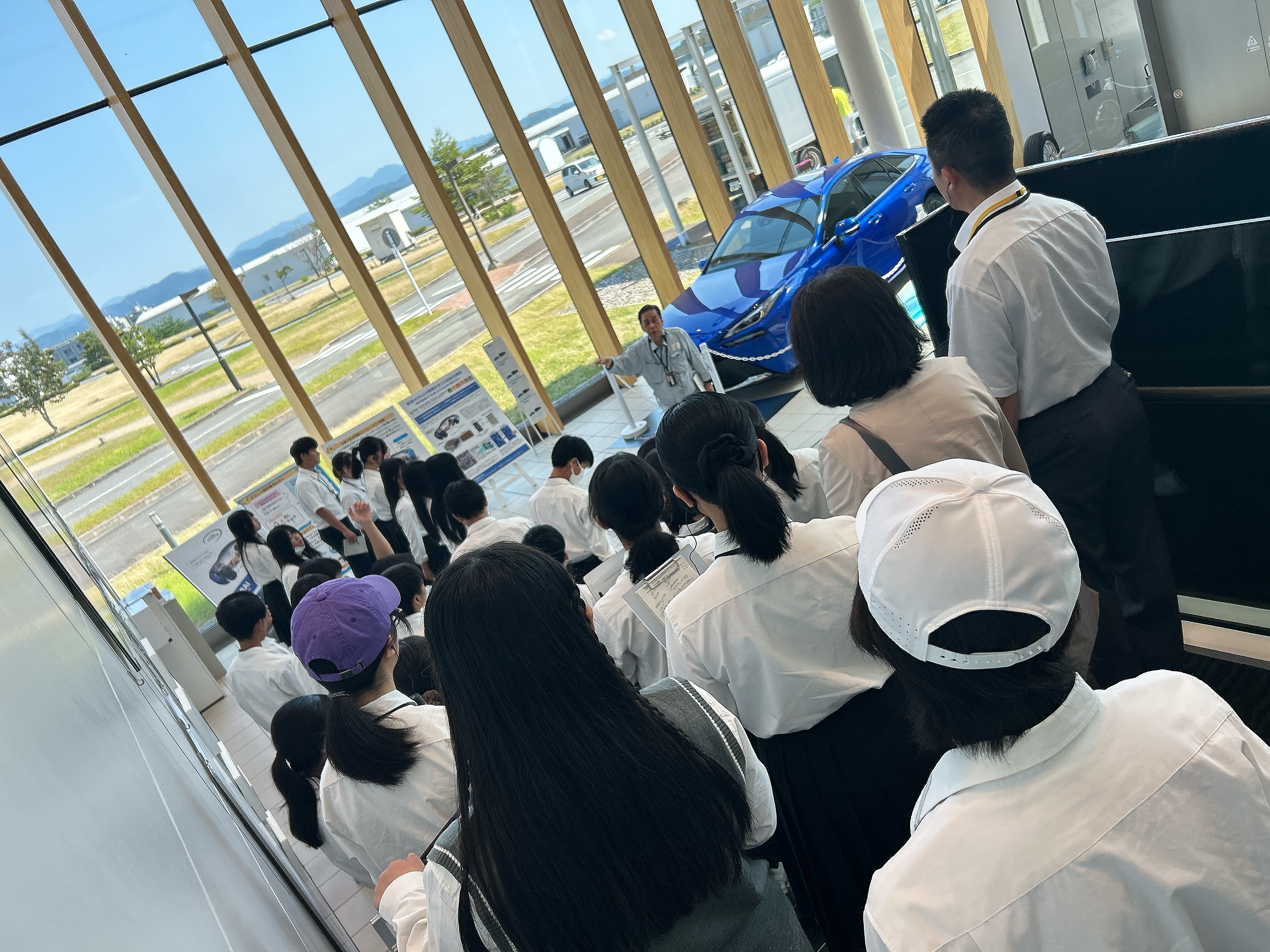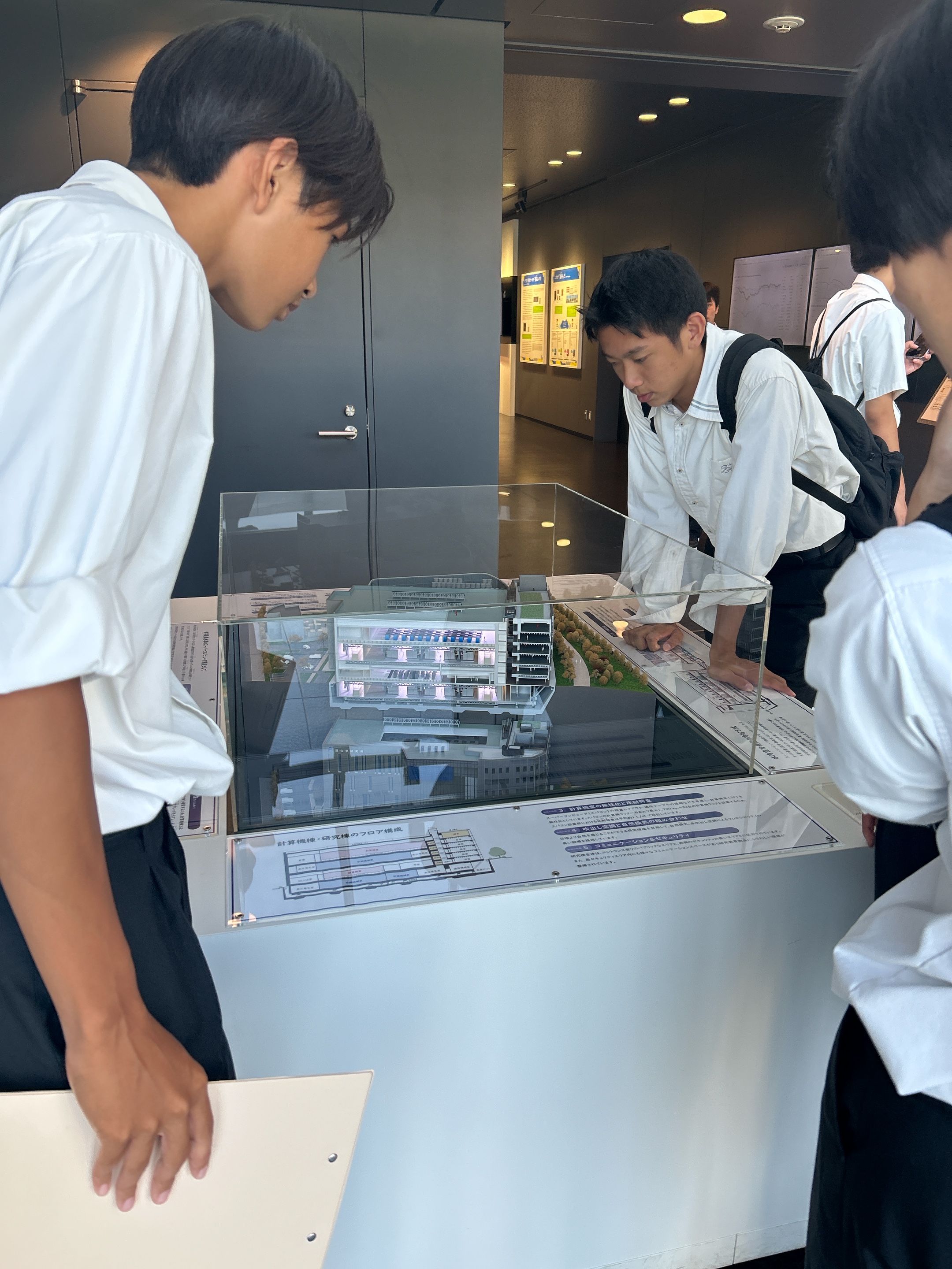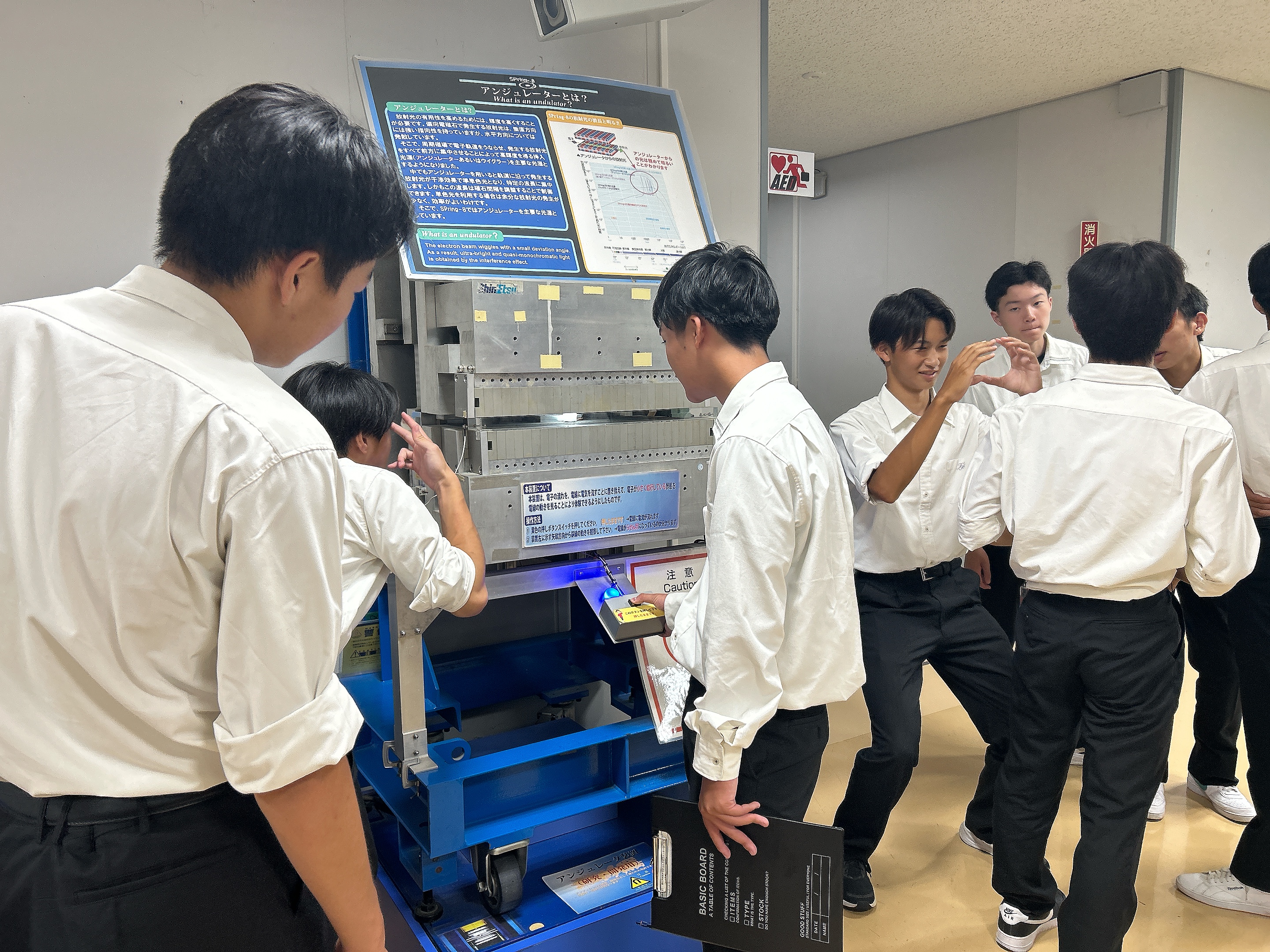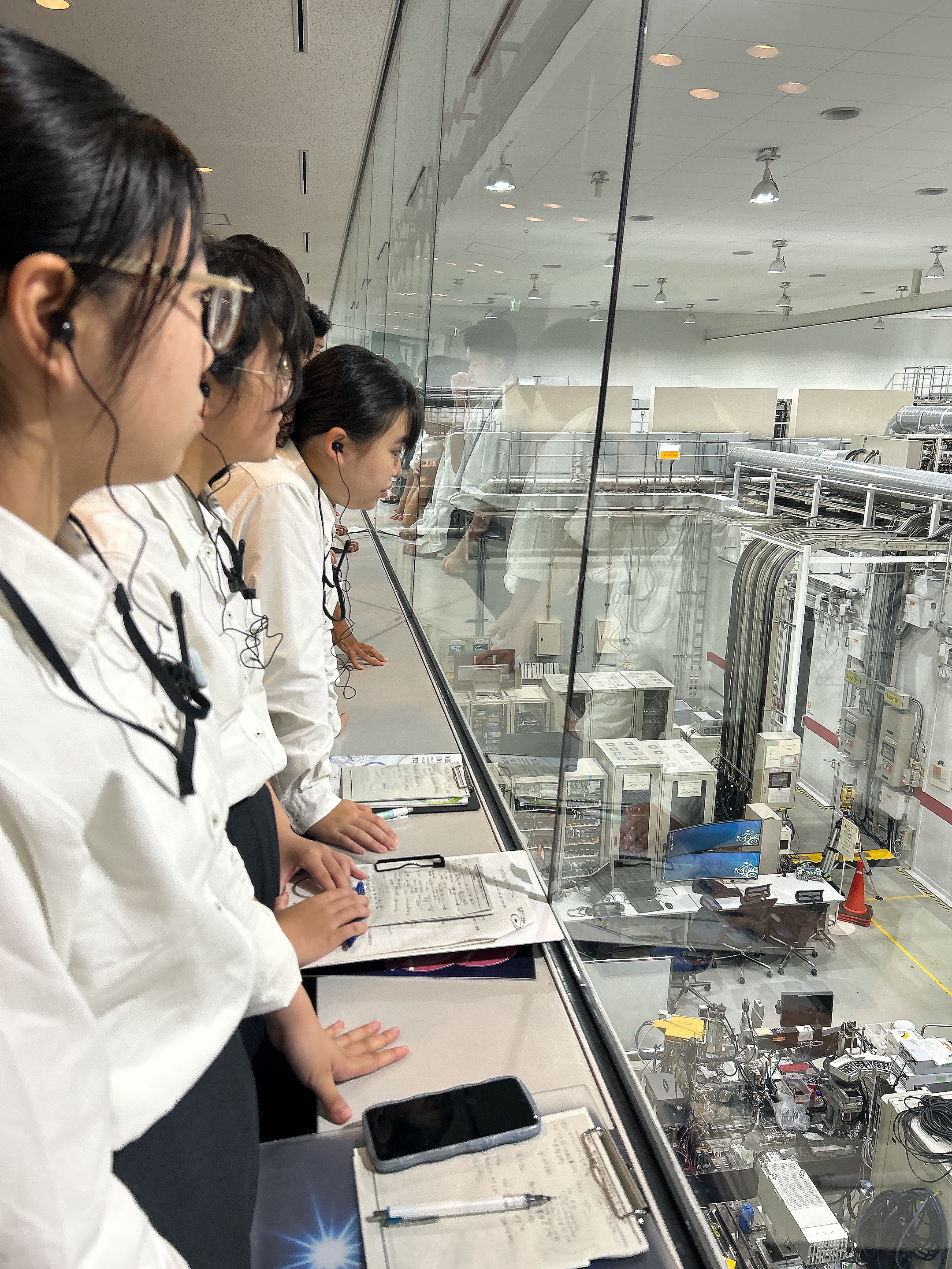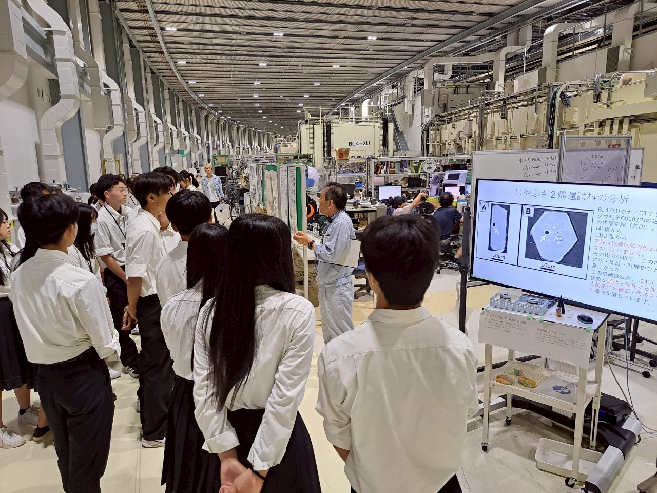 本日最初に訪れた研修場所は「SPring8」です。今回の研修旅行では移動中の車内で事前調べをしたことを担当班が発表し、質疑応答を通して学びを深めてから施設見学をしています。2日目ということもあり、生徒からの質問も活発になり、施設見学中も積極的に学ぶ姿が見られました。